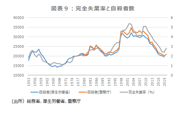 健康問題、家庭問題、勤務問題、男女関係など自殺の理由は様々だが、経済生活問題を理由とした自殺も多い。警察庁「自殺統計」と厚生労働省「人口動態統計」各々の自殺者数と完全失業率の年次データの相関係数を、データが存在する最長期間で計算すると、それぞれ0.910(1978年~2020年)、0.933(1953年~2019年)と高いことがわかる。警察庁の自殺者数は、日本における外国人も含む総人口が対象で、自殺死体認知時点で計上するのに対し、厚生労働省の自殺者数は、日本における日本人を対象とし、死亡時点で計上する。警察庁データの方が、公表が早い。