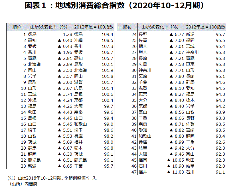 GDP統計の実質個人消費支出は直近の景気の山である18年10~12月期から新型コロナウイルスの影響が大きかった20年4~6月期にかけて▲11.0%減少した後、20年10~12月期まで+7.4%増加と戻した。18年10~12月期から20年10~12月期まででは▲4.5%の減少である。地域別消費総合指数で県別の動きを見ると、違いがみられる。景気の山からの下落率が大きい順に、福井県▲11.0%、石川県▲10.9%、福岡県▲10.0%、大阪府▲9.5%である。観光などのマイナスの影響が大きかった県が多いように見られる。一方、落ち込みが比較的小さい、あるいは増加している上位4県は、徳島県+1.3%、高知県▲0.4%、愛媛県▲0.4%、香川県▲2.0%と全て四国である。四国4県では、新型コロナウイルスの消費に与える影響が比較的小さかったようだ(図表1)。