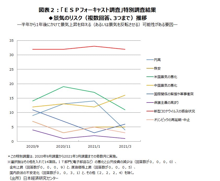 「ESPフォーキャスト調査」20年9月以降奇数月の特別調査で21年3月調査まで4回とも、景気のリスクとしては「米国景気の悪化」や「中国景気の悪化」という第2位を大きく引き離し、ほとんどのフォーキャスターが指摘したのが「新型コロナウイルスの感染状況」である(図表2)。