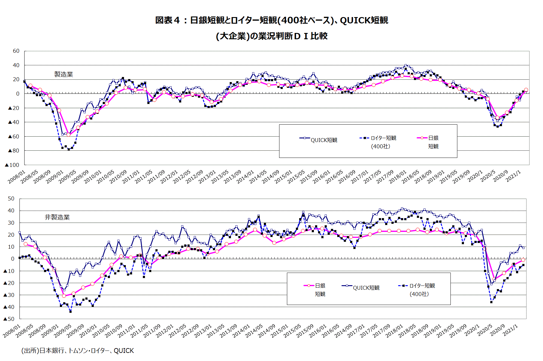 ロイター短観〔400社調査〕をみると、2月では製造業の業況判断DIは+3と輸出・生産の持ち直し傾向を受けて19年7月(+3)以来19カ月ぶりのプラスに転じ、3月も+6とプラスになった。加工業種が+10と3カ月連続プラスになった。一方、コロナ第3波の影響を大きく受けた業種が多い非製造業は▲5と改善にはあるものの13カ月連続のマイナスが続いている。QUICK短観をみると、2月では製造業の業況判断DIは+2と20年2月(+1)以来12カ月ぶりのプラスに転じ、3月調査も+4とプラスになった。一方、非製造業は足元堅調で3月調査は+9と2月の+11からは鈍化したもののプラスとなった。