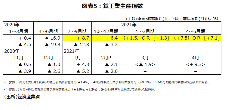 鉱工業生産指数・2月分速報値・前月比は▲2.1%と、2カ月ぶりに低下した。1月分の前月比+4.3%の大幅上昇の反動減である。最も低下寄与が大きかった自動車工業では、半導体不足の影響や、2月13日の福島県沖地震による部品供給停止の影響が出た。製造工業予測指数によると3月分は前月比▲1.9%の低下する見通しだ。3月10日時点のこの見通しに含まれていないのが、3月19日に発生した半導体製造工場の火災の影響である。昨年秋以降の世界的な半導体不足に拍車がかかる可能性がある。しかし、製造工業予測指数の4月分は前月比+9.3%と大きく上昇する見込みである。4~6月期まで4四半期連続の上昇が見込まれる状況だ(図表5)。
