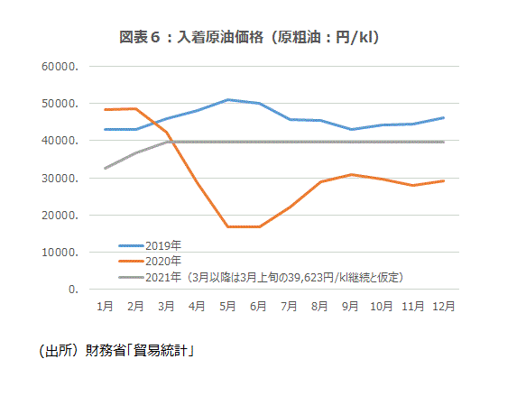 しかし、一方で先行き大きな変化が生じそうなのが、入着原油価格(原粗油)の前年同月比だ。3月上旬分の原粗油は37,279円/klで前年同旬比▲14.5%程度の下落だった。2月の36,644円/kl・前年同月比▲24.6%の下落から価格は上昇しているが、前年同月比はまだ2ケタのマイナスだ。但し、4~6月になると前年同月比は大きく変わる。仮に、3月上旬分の水準が先行き継続すると仮定すると、前年の水準が大きく変化した裏が出て、4月は+37%程度の上昇、5月は+136%程度、6月は+137%程度と倍以上の上昇率になる(図表6)。足元の人々の物価見通しはデフレ気味だが、原油価格の前年同月比の高い上昇率が意識されると、物価見通しの方向が変化する可能性があろう。