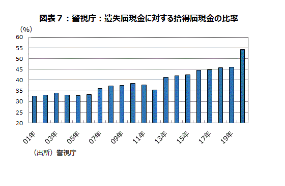 悪化傾向の自殺者データに対し、20年も改善傾向となったのが、警視庁の遺失届現金に対する拾得届現金の比率だ。コロナ禍で遺失届現金の前年比は▲27.6%、拾得届現金は同▲14.8%とともに減少であった。遺失届現金に対する拾得届現金比率は12年の35.4をボトムに8年連続上昇、20年は54.2%と19年46.0%をさらに上回った(図表7)。現金を紛失しても半分以上戻ってくるという社会の安定を示唆していよう。