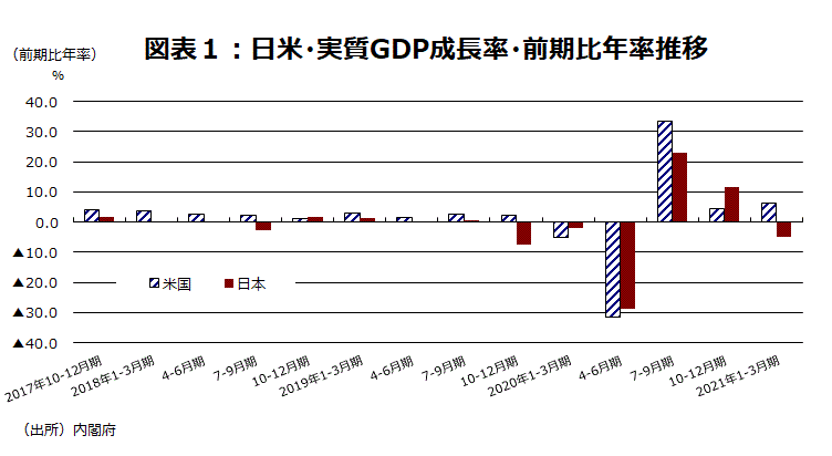 (1~3月期実質GDP、米国はプラス成長だが日本はマイナス成長。ワクチン接種進捗の差が影響か?)