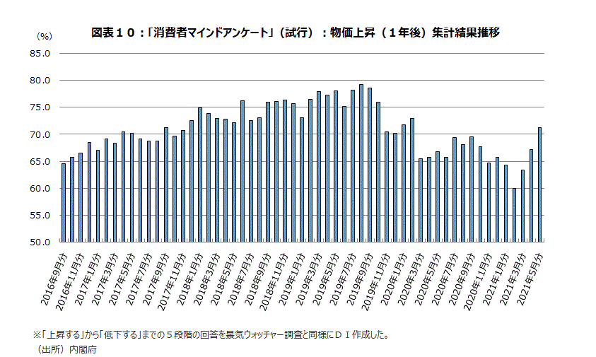 内閣府・消費者マインドアンケート調査では、1年後の物価上昇に関しても、景気ウォッチャー調査と同様5段階で聞いている。景気ウォッチャー調査と同様の方法でDIを作ると、16年9月からあるデータ史上最低になった21年2月60.0を底に上昇、5月では71.3と20年2月の72.9以来15カ月ぶり水準の水準になった(図表10)。