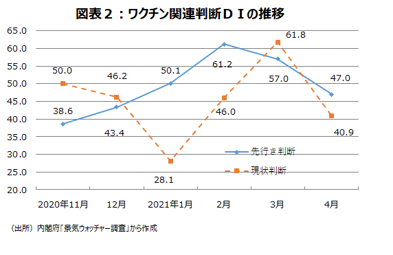 (4月「ワクチン」先行き判断DIは50割れ。期待が47「ワクチン」が接種進捗の遅れなどを反映か)
