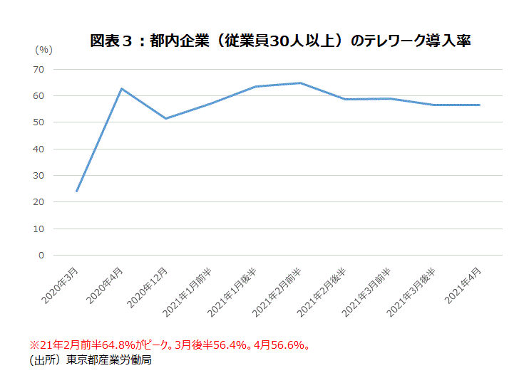 東京都は、従業員30人以上の都内の企業を対象にテレワーク導入率を調査している。20年3月に24.0%だった導入率は、最初の緊急事態宣言発令後の昨年4月に62.7%に上昇した。12月には51.4%に低下したが、21年1月に2回目の緊急事態宣言が発令されると1月後半63.5%、2月前半は64.8%と再び60%台に上がった。しかし、そこがピークで頭打ち傾向になり、3月後半は56.4%、4月は56.6%になっている(図表3)。なお、4月は前半・後半に分けた調査は実施されなかった。