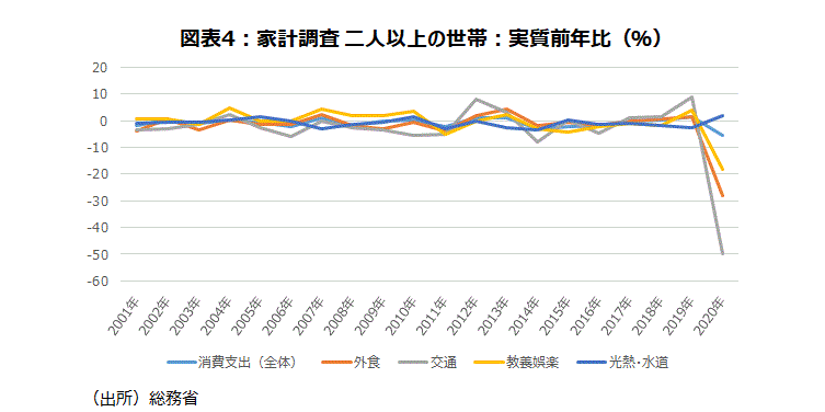 20年度の家計調査で、2人以上の世帯の実質消費支出は前年度比▲4.9%となった。比較可能な01年度以降では、消費増税の影響があった14年度▲5.1%に次ぐ史上2番目の減少率だ。新型コロナウイルス感染拡大の影響で外出自粛が進み、外食、交通、娯楽などが前年度比で大幅に減少した。一方で、テレワークなどによる巣ごもり需要で、食料や光熱費、水道代、マスクなどの支出が増えた。また、暦年データでみると、2人以上の世帯の実質消費支出は20年の前年比が▲5.3%となった。こちらは14年▲2.9%を上回る最大の減少率だ(図表4)。