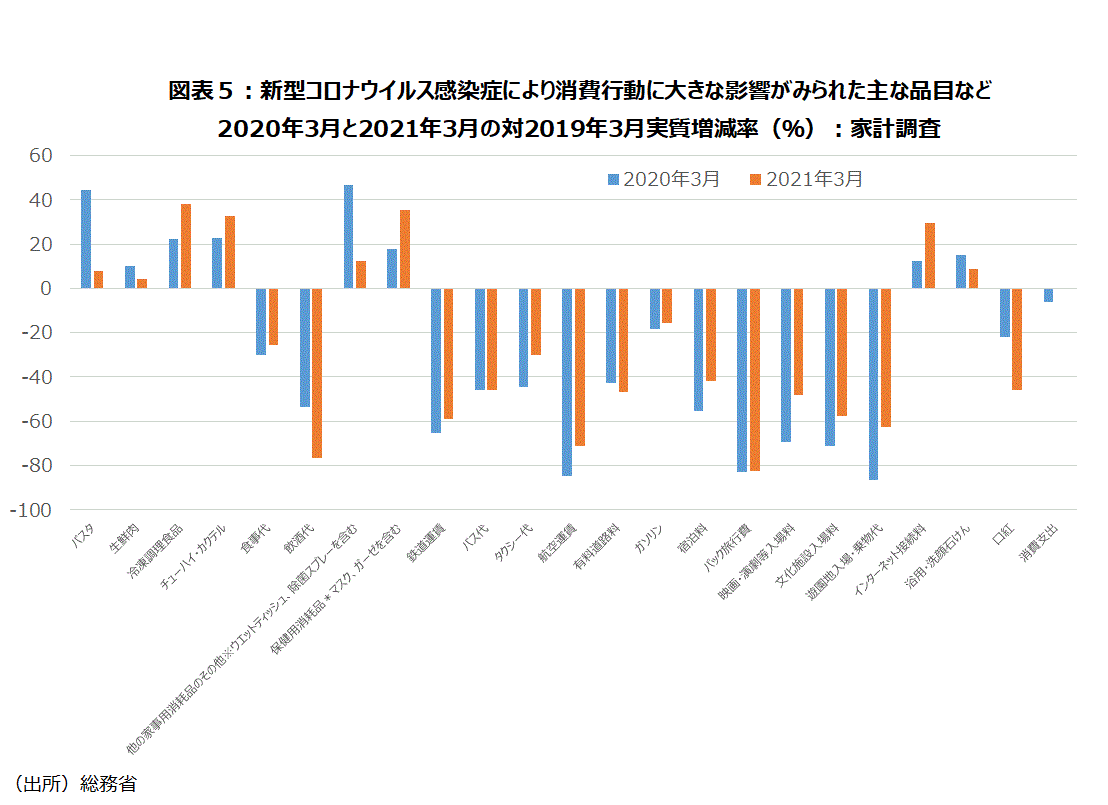 総務省統計局は20年3月分の家計調査の公表時に、追加参考図表として「新型コロナウイルス感染症により消費行動に大きな影響がみられた主な品目など」を、今回の21年3月分まで13カ月連続公表してきている。新型コロナウイルスの影響が1年以上続いているので、21年2月分から追加参考図表のデータはそれまでの対前年同月増減率(名目、実質)ではなく、対2019年同月実質増減率に変わった。