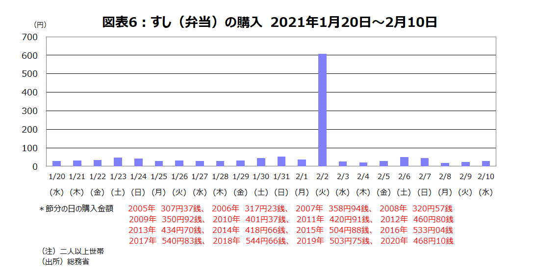 一方、購入金額が増加したのは節分の日の「すし(弁当)」だ。総務省の家計調査で恵方巻きは「すし(弁当)」に分類される。グラフの日次データをみると、毎年、節分の日は「すし(弁当)」の購買金額が通常時に比べ10倍以上になる。今年は1897年(明治30年)以来124年ぶりに2月2日の節分になったが、購入金額は通常時に比べて18倍程度の608円88銭で、昨年の節分の468円10銭から大きく増加した(図表6)。今年は家族揃って2月2日の節分に豆まきをし、「恵方巻き」を食べるという、節分の行事を行った人が多かったとみられる。