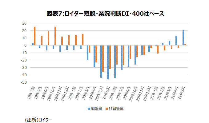 日銀短観3月調査で大企業・製造業・業況判断DIは+5と19年9月調査以来のプラスになった。一方、大企業・非製造業・業況判断DIは▲1である。 類似の月次データであるロイター短観(400社調査)をみると、2月では製造業の業況判断DIは+3と輸出・生産の持ち直し傾向を受けて19年7月(+3)以来19カ月ぶりのプラスに転じ、3月+6、4月+13、5月+21とプラス幅を拡大した。また、非製造業は5月分で+2と15カ月ぶりにプラスに転じた(図表7)。