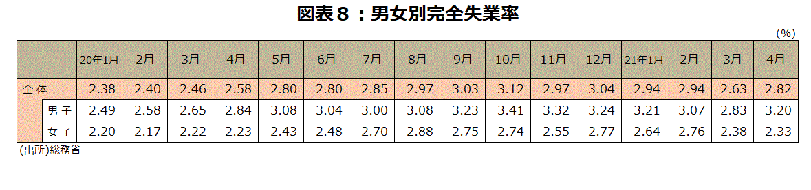 4月の完全失業率は2.8%と3月から0.2ポイント上昇した。小数点1位でみると、昨年10月以来6カ月ぶりの上昇。小数点2位でみると、昨年12月以来4カ月ぶりの上昇だ(図表8)。但し、20年度の平均2.9%よりは低く、比較的落ち着いているとみることもできる。4月の有効求人倍率は1.09倍で前月から0.01ポイントと2カ月ぶりで小幅低下した。3回目の緊急事態宣言の影響は4月時点では限定的だが、宣言は6月20日まで延長され足元の雇用の下押し要因となっている。