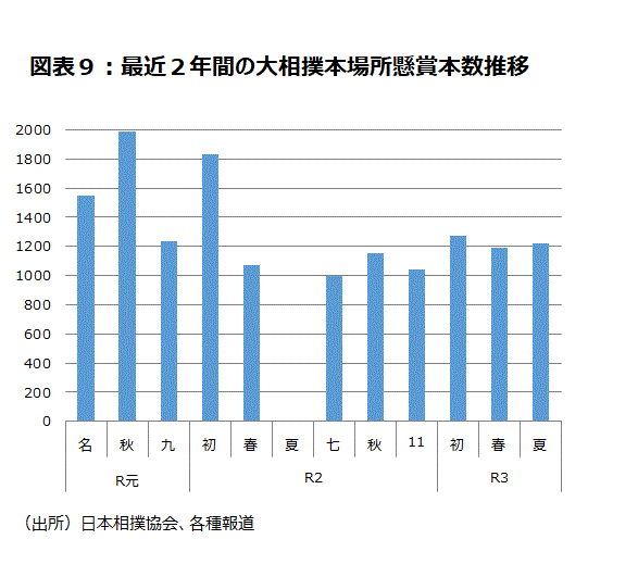 大相撲の懸賞は今年の初場所に1,270本とコロナ禍で最高を記録した。しかし、コロナの影響がほとんどなかった20年1月との比較である前年同場所比は▲30.8%の大幅減少だった。3月の春場所は通常の大阪開催でなく両国国技館で開催された。懸賞は1,191本となった。前年春場所比は+11.5%の増加であった。2年ぶりに開催された5月の夏場所の懸賞は1,218本となった(図表9)。コロナ禍では2番目に多い本数である。それなりの底堅さが感じられる数字と思われる。
