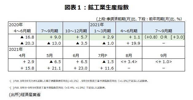 鉱工業生産指数・7月分速報値・前月比は▲1.5%と、2カ月ぶりに低下となった。全15業種のうち、半導体製造装置などの生産用機械工業など9業種が前月比上昇したものの、自動車工業や電気・情報通信機械工業等の6業種が前月比低下し、全体として低下となった。自動車工業等では、半導体不足が長引いているところに、新型コロナウイルスの感染拡大のためアジア各国で経済活動が制限されたことによる部材調達不足の影響が出たようだ。先行きの鉱工業生産指数、8月分を先行き試算値最頻値前月比(+0.1%)で延長したあと、9月分を製造工業予測指数前月比(+1.0%)で延長すると、7~9月期の前期比は+0.8%の上昇になる。また、8月分・9月分を製造工業予測指数前月比(+3.4%、+1.0%)で延長すると、7~9月期の前期比は+3.0%の上昇になる。7~9月期は5四半期連続の前期比上昇になる可能性が大きいだろう(図表1)。もっとも半導体不足の影響や新型コロナの変異ウイルスの動向などによる、下振れの可能性に注視する必要があろう。
