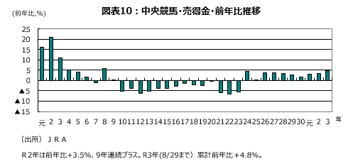 他の身近なデータも順調に推移しているものが多い。例えば、競馬売上高だ。20年のJRA(日本中央競馬会)の売得金は前年比+3.5%と9年連続の増加になった。21年8月29日時点までの累計前年比は+4.8%の増加になっている(図表10)。10年連続上昇に向けて順調に推移している。