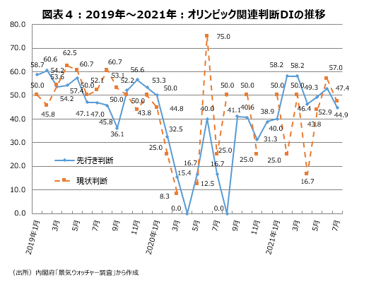 現状判断でオリンピックに触れたウォッチャーは164人で、6月の32人から大きく増加した。しかし、オリンピック関連・現状判断DIは47.4で6月の57.0から低下した。それでも5月の43.8を上回っていて底堅い数字にはなった(図表4)。東京都の一般レストラン経営者は「東京オリンピックも、業種によっては好況をもたらしているようだが、外食に関しては新型コロナウイルス感染に対する忌避感があり、客足が遠のいている」とコメントをしている。
