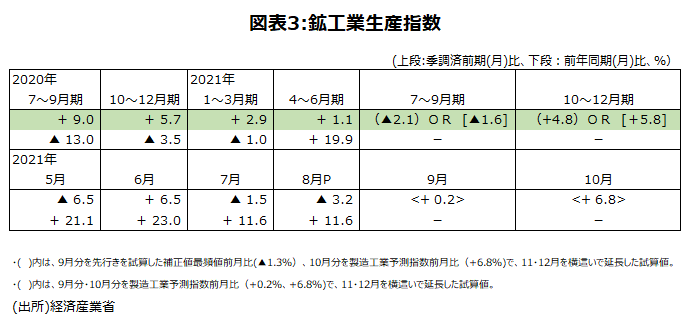 鉱工業生産指数8月速報値・前月比は▲3.2%と、7月・同▲1.5%に続き2カ月連続の低下となった。全体15業種のうち、窯業・土石製品工業など3業種が前月比上昇したが、自動車工業を中心に、電気・情報通信機械工業を始め12業種が低下したことから全体として低下した。半導体不足が長引いているところに、新型コロナウイルス感染症の拡大を受けたアジア各国での経済活動制限等による部材調達不足の影響が出たようだ。経済産業省の基調判断は7月までの「生産は持ち直している」から、8月で19年1月・2月以来の「生産は足踏みをしている」に引き下げられた。先行きの鉱工業生産指数、9月を先行き試算値最頻値前月比(▲1.3%)で延長したあと、10月を製造工業予測指数前月比(+6.8%)、11月・12月を前月比横這いで延長すると、7~9月期の前期比は▲2.1%の低下に、10~12月期の前期比は+4.8%の上昇になる。7~9月期は5四半期ぶりに、一時的な前期比低下になる可能性が大きい状況だろう(図表3)。
