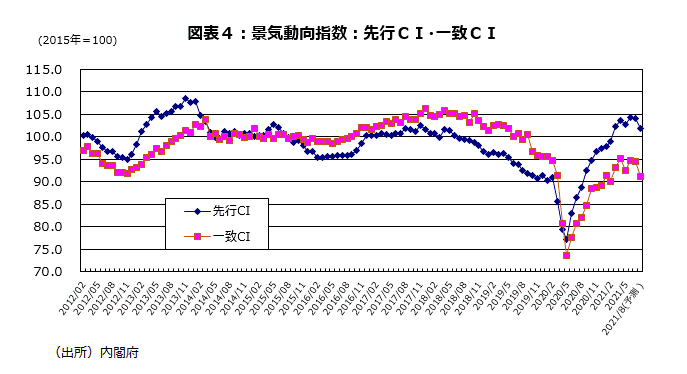 景気動向指数・一致CIは7月・8月と2カ月連続で下降になりそうだ(図表4)。しかし、8月の景気の基調判断は、景気拡張の可能性が高いことを示す「改善」が継続されるとみられる。景気拡張の動きが足踏み状態になっている可能性が高いことを示す「足踏み」に下方修正される条件は「3カ月後方移動平均(前月差)の符号がマイナスに変化し、マイナス幅(1カ月、2カ月、または3カ月の累計)が1標準偏差分以上 かつ 当月の前月差の符号がマイナス」になることである。8月では、一致CIと3カ月後方移動平均の前月差が2か月連続で下降になろう。「足踏み」に下方修正されないのは、8月の3カ月後方移動平均は、前月差がマイナスだった7月との2カ月合計でも前月差累計が1標準偏差分の▲1.00には届かないと思われるためだ。10月以降は緊急事態宣言全面解除のプラス効果が出よう。