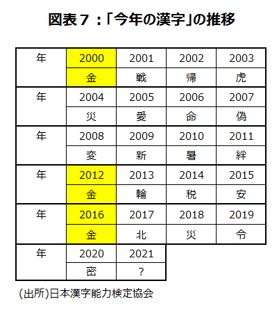 「今年の漢字」は毎年12月12日頃に発表される。12月12日が「漢字の日」だからで、12(いいじ)月12(いちじ)日の語呂合わせから定められたという。昨年は12月14日(月)に発表されたように12月12日が土曜日・日曜日に当たるときは次の平日になるので、今年は12月13日(月)ではないかと予想される。「今年の漢字」はそのときどきの景気局面や経済状況を映す。景気が良く明るいムードが社会に満ちているときは、前向きな意味の漢字が選ばれる傾向にある。直前の地震の影響が大きかった2004年の「災」や、リーマンショックの2008年の「変」のようなショッキングな出来事がない場合、2000年、12年、16年と夏季オリンピック開催年の漢字は「金」になっている(図表6)。五輪の「金」メダルが注目されるようだ。東京オリンピックは2021年に延期になり、2020年の今年の漢字は新型コロナウイルス関連から選ばれ「密」だった。今年の東京オリンピックで日本は過去最高の金メダル27個を獲得した。なお、パラリンピックでの日本の金メダルは2004年アテネ大会の17個以来となる過去4番目タイの13個だった。今年の漢字は4度目「金」が選ばれる可能性が大きそうだ。