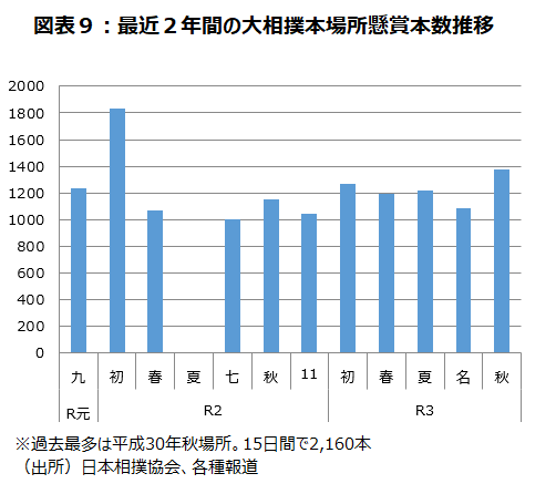 過去最多の大相撲懸賞本数は平成30年秋場所の2,160本である。直近の景気の山の1カ月前に当たる場所でのことだった。他に2千本台は、平成29年夏場所の2,053本だけだ。新型コロナウイルス感染症が経済活動に負の影響を及ぼす直前の令和2年初場所の懸賞本数は、1,835本だった。新型コロナウイルスの感染が広がり無観客開催になった令和2年春場所の懸賞本数は1,068本まで減少した。アベノミクス景気が始まって1年程度経った平成25年九州場所以来の低水準である。令和2年夏場所は中止であった。以降、令和2年7月場所から令和3年名古屋場所までの7場所での懸賞本数は1,000本から1,270本の間で推移した。コロナ禍での最多は、令和3年初場所の1,270本だったが、秋場所の懸賞本数は1,373本になり、コロナ禍での最多を更新した(図表9)。