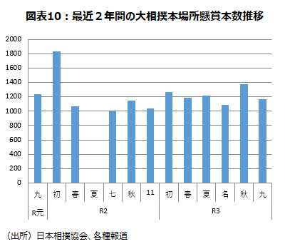 大相撲の11月場所は2年ぶりに九州場所として開催された。懸賞は15日間で1,163本、前年同場所比+1.0%と3場所連続での増加となった(図表10)。但し、2年前は1,234本なので前々年比▲5.8%とまだ、コロナ禍前の本数には届かなかった。