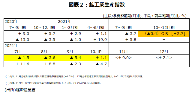 半導体不足、アジアのコロナ禍に伴う部材供給不足で7~9月期は5四半期ぶりに前期比低下になったが、生産指数は先行き上昇が期待されている。なお、10~12月期は前期比上昇に戻れるかどうかはまだ微妙な状況だろう(図表2)。足元で、新型コロナウイルスの新たな変異株オミクロン型が発生したことで今後の動向が注視される。