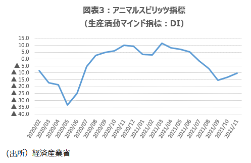 経済産業省が製造工業生産予測指数から作成しているアニマルスピリッツ指標(生産活動マインド指標:DI)は21年5月調査結果で、11カ月連続のプラスの数値となり、企業の生産マインドは強気の状況が続いていたが、6月~11月調査結果ではDIはマイナスになっている。11月調査結果のDIは▲10.2である。まだ、弱い数字だが、10月調査結果からは2.8ポイント改善した。これで2カ月連続改善となった(図表3)。
