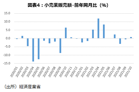 商業動態統計の小売業販売額(季節調整値)の10月分速報値・前月比+1.1%の増加となった。新型コロナウイルス感染拡大の落ち着きや緊急事態宣言の解除による、消費の回復を反映した数字である。前年同月比は+0.9%と3カ月ぶりの増加になった。20年10月分の前年同月比は+6.4%の増加であり、10月分の前年同月比は2年連続増加となったので、新型コロナウイルスの感染拡大以前の水準に戻ったと言える。前年同月比が2年連続増加になったのは、20年2月分以来、1年8カ月ぶりだ(図表4)。