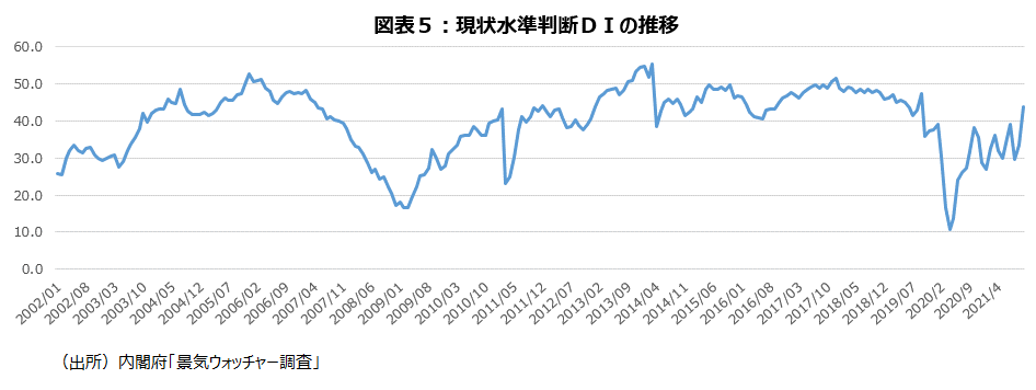 現状判断には、新聞・テレビで大きく報道される、方向性を示す現状判断DIの他に、水準を示す現状水準判断DIがある。10月の現状水準判断DIは43.8と19年9月(47.3)以来の水準になったことは景況感のレベルがコロナ前に戻ったことを意味する(図表5)。