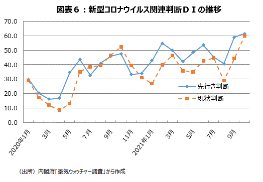 10月の新型コロナウイルス関連の、現状判断DIは59.8、先行き判断DIは61.4で、どちらも新型コロナウイルスが景気ウォッチャー調査に登場した20年1月以降の最高水準を更新した。現状判断、先行き判断とも新型コロナウイルス関連DIは全体DIを上回り、新型コロナウイルスが景況感の足を引っ張らなくなったことを示唆している(図表6)。ワクチン接種の全人口に対する完了割合が10月末(29日)に71.2%まで上昇する中、10月のワクチン関連判断DIは現状判断DIが55.8、先行き判断DIが68.1と景況判断の分岐点50を上回った。
