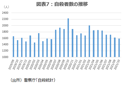 完全失業率と相関が高い自殺者数も改善傾向だ。10月の自殺者数の暫定値を1,590人になった。前年同月比は▲28.7%と大幅な減少である。前年同月比が減少になったのは、7月以降4カ月連続である。21年1月から10月までの自殺者数の累計は17,620人で、前年20年の同期の17,493人と比べて0.7%多い状況だ(図表7)。11月・12月次第で、前年比で若干の減少になる可能性もありそうだ。