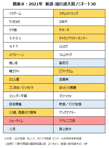 2021年は「新型コロナウイルス」と「東京オリンピック・パラリンピック」が大きな話題になった1年だったと思われる。30のノミネート語をみると、「新型コロナウイルス」関連語では「自宅療養」「人流」「副反応」「変異株」「黙食/マスク会食」「路上飲み」の6語が選ばれた。全体の20%に当たる(図表8)。1年前の2020年は「新型コロナウイルス」関連語は、年間大賞に選ばれた「3密」をはじめとして、「新しい生活様式/ニューノーマル」、「アベノマスク」、「アマビエ」、「エッセンシャルワーカー」、「おうち時間/ステイホーム」、「オンライン○○」、「クラスター」、「GoToキャンペーン」、「自粛警察」、「Zoom映え」、「ソーシャルディスタンス」、「テレワーク/ワーケーション」、「濃厚接触者」、「PCR検査」と全体の50%に当たる15語であった。さらに、ステイホームが増えて利用が増えた「ウーバーイーツ」や、人との接触を避けることができる「ソロキャンプ」をも「新型コロナウイルス」関連語に加えると57%に当たる17語と過半数だった。