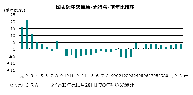 コロナ禍でも順調に推移している身近なデータは多い。競馬売上高の足元のデータを確認しよう。JRA(日本中央競馬会)の売得金は20年ではネットでの馬券購入が増加し無観客開催の影響を相殺し、前年比+3.5%と9年連続の増加になった。21年は11月28日時点までの年初からの累計前年比は+3.4%の増加になっている(図表9)。10年連続上昇になる可能性が大きい。