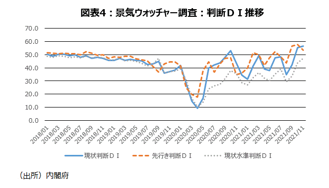 11月の「景気ウォッチャー調査」は、現状判断DIが56.3と前月比0.8ポイント上昇した。新型コロナウイルスの感染が落ち着いたことで、3カ月連続改善し、2005年12月(57.5)に次ぐ過去2番目の高水準になった。但し、10月に前月比12.9ポイント上昇し、56.6と、2013年11月(57.6)以来の高水準となった先行き判断DIが、11月には4.1ポイント低下の53.4に低下した。11月調査では25日から月末までが調査期間なので、オミクロン型変異株への懸念が先行き判断に表れたかたちだ(図表4)。