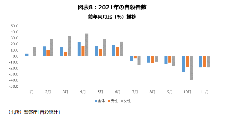 完全失業率と相関が高い自殺者数は、21年前半は前年同月比増加傾向だったが、後半は減少傾向だ(図表8)。11月の自殺者数の暫定値を1,541人になった。前年同月比は▲18.6%の減少である。前年同月比が減少になったのは、7月以降5カ月連続だ。21年1月から11月までの自殺者数の累計は19,285人で、前年20年の同期の19,386人と比べて▲0.5%少ない状況だ。12月速報値の自殺者が、万一前年より、100人多い1,795人になっても、2021年の自殺者合計は21,080人になり、2020年の21,081人を下回る。