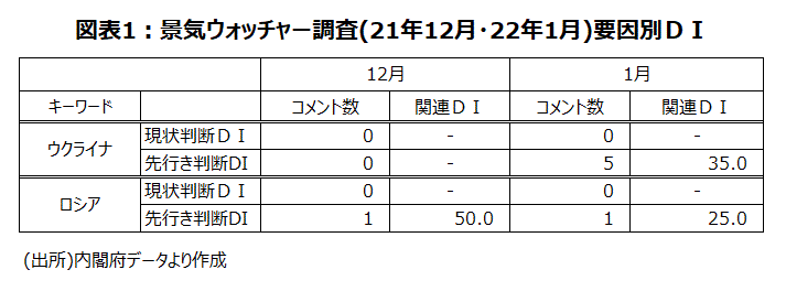 景気ウォッチャー調査では「ウクライナ」に関するコメントは21年12月調査では0件だったが、1月調査(25日~31日が調査期間)になって初めて先行き判断で5件出てきた。DIは35.0で、景気判断の分岐点50を下回った。「ロシア」に関するコメントは、12月調査で1件あったが新型コロナに関するものだった。しかし、1月調査では同じ1件でも、「やや悪化する」の判断理由として「ロシアがウクライナに侵攻する可能性がある」という南関東の通信業経営者のコメントが出ていた(図表1)。2月25日~28日が調査期間の2月調査では、「ウクライナ」「ロシア」に関するコメントが大きく増加することが予想される。