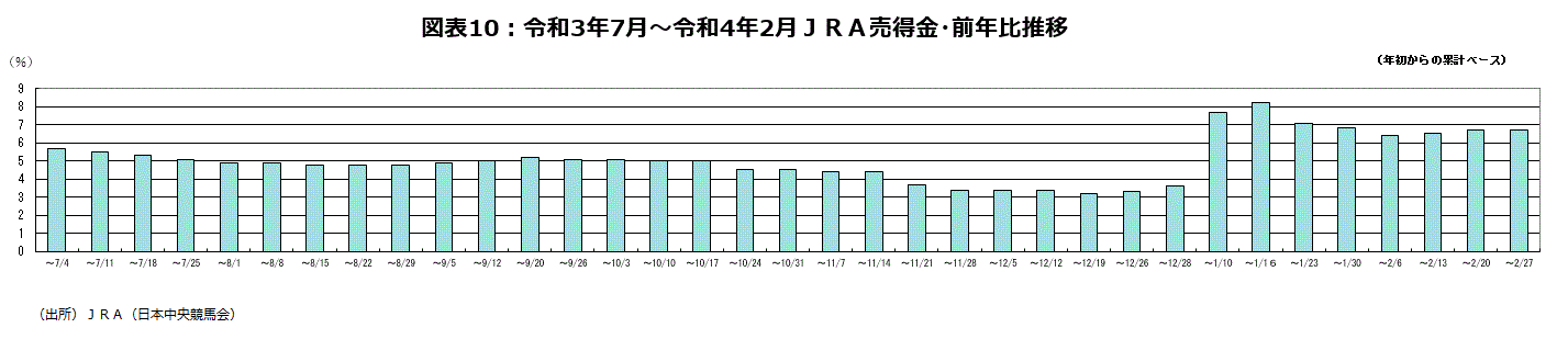 順調に推移している身近なデータは依然多い。競馬売上高の足元のデータを確認しよう。JRA(日本中央競馬会)の売得金は21年で前年比+3.6%と10年連続の増加になった。22年は2月27日時点までの年初からの累計前年比は+6.7%の増加になっている。11年連続増加に向け、順調に推移している(図表10)。今年初のG1レースは2月20日に行われたフェブラリーステークスの売得金が前年比+17.9%の増加となった。これでG1レース昨年12月5日のチャンピオンズカップ以来6レース連続して前年比増加となっている。