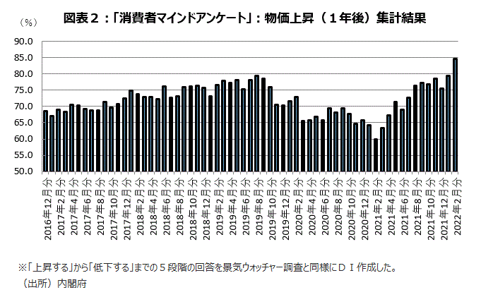 ロシアのウクライナ侵攻の影響で、天然ガス、原油などのエネルギー価格や、小麦などの食品価格の上昇懸念が高まっている。内閣府の「消費者マインドアンケート調査」の物価見通し(5段階評価)から景気ウォッチャー調査流のDIを作成すると、直近22年2月調査で16年9月の統計開始以来の最高水準を更新した(図表2)。