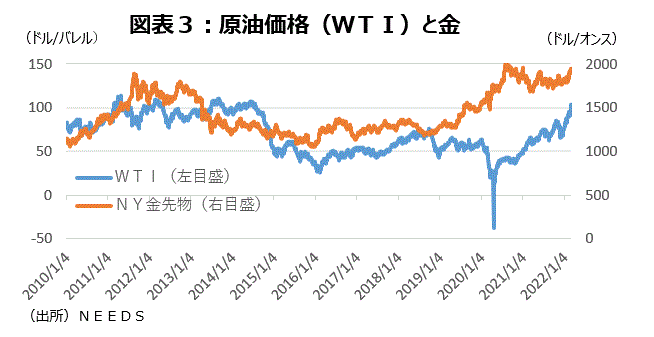 ロシアによるウクライナへの軍事侵攻の影響で原油価格や小麦粉の値上がりが懸念される。原油価格は3月1日のWTIが103.41ドル/バレルと2014年7月以来7年8カ月ぶりの水準に上昇した。安全資産である金価格も大きく上昇している(図表3)。2014年2月下旬-3月のロシアによる違法なクリミア併合が行われた時のWTIは100ドル/バレル前後で推移していた。しかし、14年12月31日の終値は53.27ドル/バレルと約半値まで低下した。原油下落の要因は、欧州や新興国の景気が鈍化し世界的に需要が減ったことや、当時生産量が増加していた米国のシェールガス潰しを意図しOPECが減産を拒否して価格下落を容認したことだった。