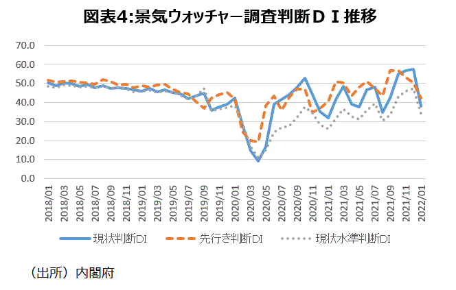 21年では1月8日~3月21日、4月25日~6月20日、7月12日~9月30日の合計3度(対象地域は様々)の緊急事態宣言が発令された。実質GDPや景気ウォッチャー調査の現状判断DIなどは、発令の度に影響を受け変動が生じ、ジグザグと推移した(図表4)。昨年発令された第1回まん延防止等重点措置は4月5日~9月30日。現在は、まん延防止等重点措置が22年1月9日~3月6日の予定で発令されている。一部地域では延長される見込みだ。22年1月分発表時に過去に遡って修正された景気ウォッチャー調査の現状判断DI (季節調整値)は、21年~22年のデータを見ると、緊急事態宣言または、まん延防止等重点措置が発令されていた9カ月の平均は40.0、一方、発令されていなかった4カ月の平均は54.5と違いが明らかである。なお、緊急事態宣言が発令時でも、20年の第1回目(4月7日~5月25日)のように、2000年の統計開始以来最低の数字である9.1を記録したように極度に落ち込むことはなく、20年5月を谷とする緩やかな景気拡張局面が続いていると思われる。