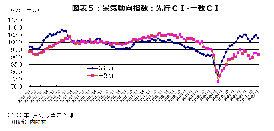 1月分の景気動向指数・一致CIは前月差2カ月連続の下降になるとみられる(図表5)。景気の基調判断は、景気拡張の動きが足踏み状態になっている可能性が高いことを示す「足踏み」継続になると予測する。予測通りだと3カ月後方移動平均の前月差は上昇になるが、単月の前月差はマイナスになるため、「改善」に戻る条件の「3カ月以上連続して、3カ月後方移動平均が上昇」は満たさないだろう。