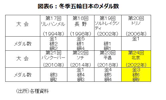 日本選手の活躍で金メダル3個、銀メダル6個、銅メダル9個、合計18個と、過去最高のメダル獲得となったが、いつものオリンピックと違い、モヤモヤ感が残った(図表6)。笑顔のロコソラーレのカーリング女子初の銀メダルなど明るい話題もあったが、銀メダルは負けてもらうメダルのため、悔しさも残っただろう。金メダルを獲得した3選手も、出場した別の試合で悔しい思いをしたり、不可解な採点を再度の完璧な演技で塗り替えた結果だったりと、手放しで喜べる内容でなかった。また史上初の4回転アクセルと3連覇に挑んだ男子フィギュアスケートの羽生選手は、ショートプログラムで氷の穴につかまり8位スタートでメダルを逃してしまった。女子フィギュアの坂本選手の銅メダルも、ワリエワ選手のドーピング問題でガタガタしている中での快挙であった。大会期間を通してみると、日経平均株価は冴えなかった。