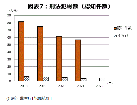 刑法犯総数の認知件数は近年減少傾向にあり、昨年は56.8万件と前年比▲7.5%の減少であった。但し、22年になって最初の1月分で異変が起きた。4.2万件で、前年同月比+1.8%と増加に転じた(図表7)。2月分以降の動向は要注目だ。