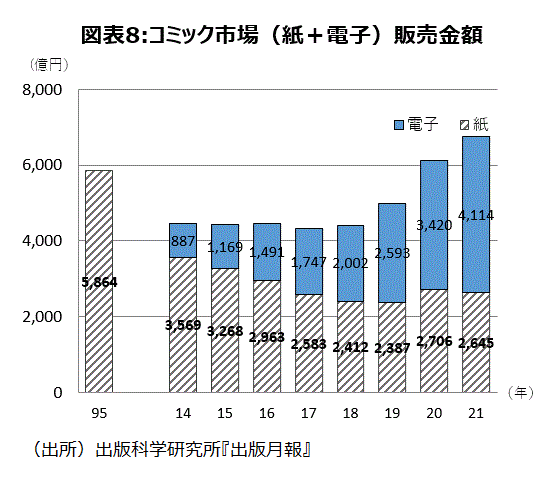 出版科学研究所は電子コミックに関する統計を2014年から開始している。電子コミック市場は21年まで7年連続の増加になっている。21年の前年比は+20.3%の増加である。紙と電子を合わせたコミック市場は、17年を底にして4年連続増加している。