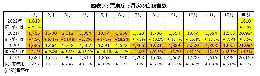 完全失業率は21年平均では2.8%と20年と同じになった。また、21年12月は2.7%である。21年で最も高かった月は5月の3.0%で一番低かったのは3月の2.6%であった。コロナ禍でも、様々な対策の効果で、落ち着いた数字となっている。完全失業率と相関が高い自殺者数は、21年前半は前年同月比増加傾向だったが、21年後半と22年1月は7カ月連続減少だ。警察庁発表の21年の自殺者数は、20,984人、前年比は▲0.5%の減少である。22年1月暫定値の自殺者数は1,610人で、前年同月比▲8.3%の減少だ(図表9)。