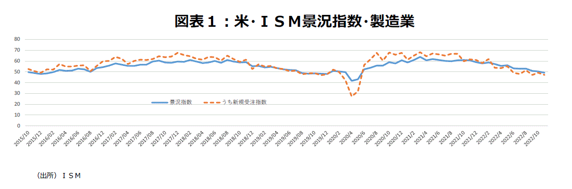 日本のエコノミストのコンセンサス調査である「ESPフォーキャスト調査」で、20年9月から奇数月に特別調査として「3つの景気腰折れリスク」について尋ねている。21年9月まで1年超にわたり「新型コロナウイルスの感染状況」が第1位だった。しかし21年11月以降は「中国の景気悪化」「原油価格の上昇」など毎回第1位が変わった。22年7月・9月・11月は3回連続して「米国の景気悪化」が第1位となった。「中国の景気悪化」が9月・11月と2回連続して第2位である。高水準のインフレに対抗するためFRBが通常の3倍の0.75%の利上げを4連続で実施するなど、ブレーキを踏んだことで来年前半には米国景気は減速する見込みだ。11月ISM景況指数は49.0となり、20年5月以来2年半ぶりに、製造業の景況拡大と縮小の分岐点50割れとなった(図表1)。一方、7~9月期の米国の実質GDPは前期比年率+2.9%と3期ぶりの増加になり、10~12月期はAtlanta連銀GDPNOWによると、12月1日現在+2.8%と2四半期連続で増加する見通しである。足元は強弱両方の統計が混在している。