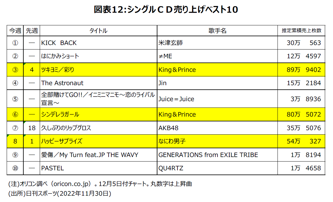 厳しい環境下でも景気拡張局面が継続していることを示唆する身近なデータのひとつに、音楽シングルCDで初動売上げ50万枚超が継続して出ていることが挙げられる。楽曲が格安価格でダウンロードできる時代、CDはファンが持っていたいから買う贅沢品になり、景気動向を敏感に反応する。経験上、目安は初動売上げ50万枚超かどうかだ。9月14日発売『TraceTrace』が初動売上げで50.0万枚になったKing&Princeは、来年5月のメンバー脱退報道もあって、11月9日発売の『ツキヨミ/彩り』が初動売上げで79.1万枚になった。12月5日付チャートでは第3位で11月27日までの累計は89.9万枚だ。ちなみに12月5日付チャートではデビュー曲の『シンデレラガール』が第6位で11月27日までの累計は80.5万枚になった。11月16日発売のなにわ男子の『ハッピーサプライズ』が初動売上げで51.6万枚になった。11月27日までの累計は54.0万枚だ(図表12)。