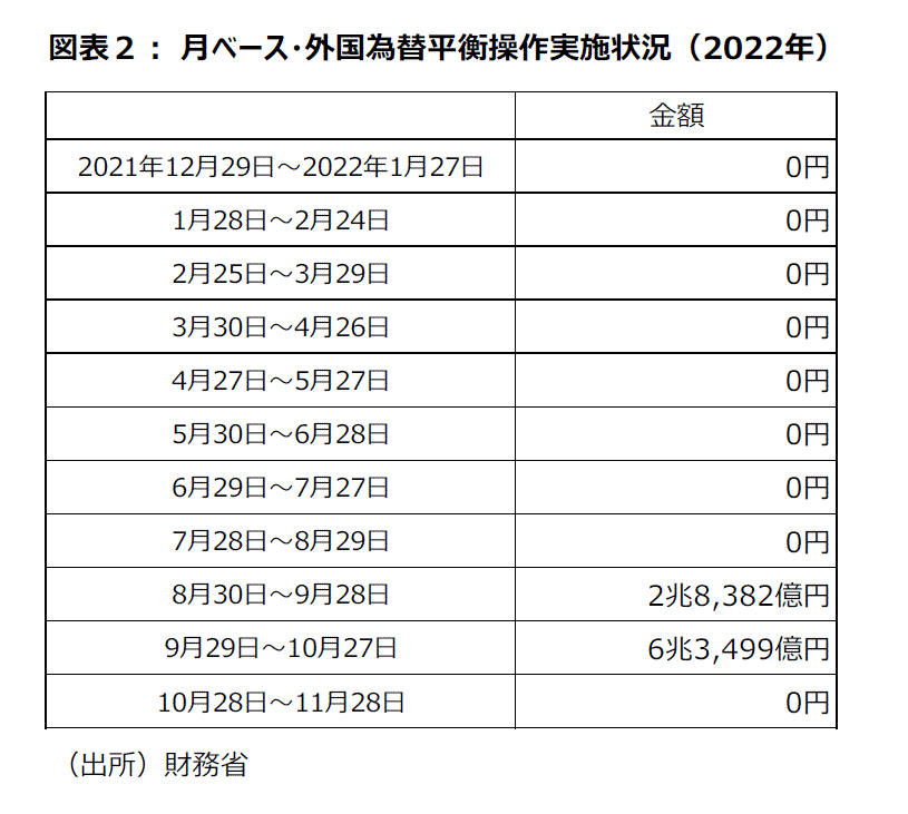 財務省は月ベースで外国為替平衡操作実施状況を公表している。政府・日銀は急速な円安を阻止するため9、10月に巨額の円買い・ドル売りを実施した。公表された数字は、8月30日~9月28日に2兆8,382億円、9月29日~10月27日で6兆3,499億円と、今回の円安局面で実施した円買い介入の総額は9兆円以上に達した。一方、10月28日~11月28日の介入額は3カ月ぶりにゼロだった(図表2)。