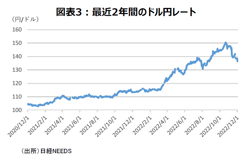 ドル円相場は11月30日の東京市場終値では138円台に、さらにパウエルFRB議長発言で12月1日には一時135円台となった。一時1ドル=152円を窺う水準となった急激な円安は、足元で一服している(図表3)。
