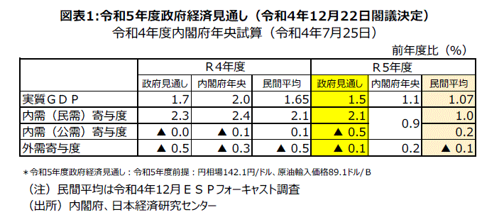 米欧中銀の金融引き締めによる世界景気の減速懸念が強く、外需に期待はもてない状況だ。40名弱のエコノミストのコンセンサス調査である「ESPフォーキャスト調査」12月調査で、23年度の実質GDP成長率・予測平均値は+1.07%の増加である。新型コロナウイルス感染が拡大し実質GDPが▲4.1%と大幅減だった20年度から増加に転じ、+2.5%だった21年度、+1.65%が予測平均値の22年度に続き、3年連続プラス成長になると予測されている。23年度のGDP成長率に対する外需寄与度の予測値平均は▲0.1%で、政府経済見通しの外需寄与度▲0.1%と同じである(図表1)。また、「ESPフォーキャスト調査」の特別調査によると、最大の景気腰折れリスクは直近の11月調査まで3回連続で「米国景気悪化」、9月・11月と2回連続して第2位が「中国の景気悪化」である。足元では、中国の爆発的な新型コロナの感染拡大が懸念されている。